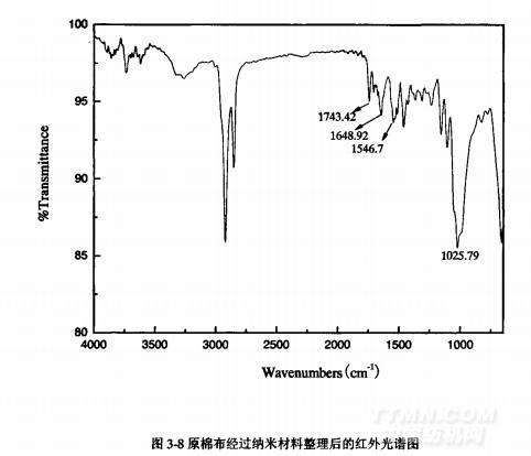 為了更好的說(shuō)明納米材料和棉纖維的交聯(lián)情況,對(duì)棉織物進(jìn)行了紅外光譜測(cè)試,見(jiàn)圖3.8。