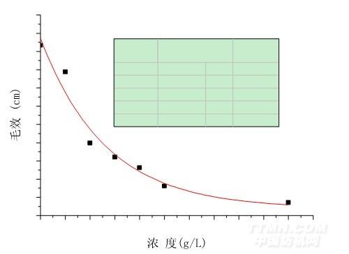 △P 的大小主要取決于θ和 r 的大小。當接觸角 0°<θ<90°時,COSθ大于零,△P 大于零,外界對水滴施加的壓力和毛細管附加壓力方向相同,水就能順利通過毛細管。當觸 角 90°<θ<180°時,COSθ小于零,△P 小于零,毛細管附加壓力阻止水的透過。在本 試驗中,隨著濃度的增大,試樣的接觸角逐漸增大,拒水性能越來越好,導致毛效快速的下 降。