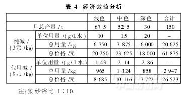 目前,市場上純堿的價格是3元/kg,代用堿的價格為9元/kg,根據(jù)一年來每月染色情況分析,淺中深顏色比例基本為:淺色45%,中色35%,深色20%,按每月150t生產(chǎn)量計算,使用純堿和代用堿的成本分析見表4。