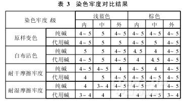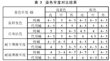 由表3可知,用新型堿劑EF-3代替純堿染色,色牢度都在規(guī)定范圍之內(nèi),符合要求。