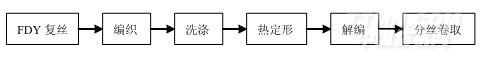 而傳統的假編變形工藝是先用分絲機將復絲分成單絲后,再用小口徑(100mm左右)針織機將單絲分別織成編織物,經熱定型使織物上的卷曲狀態固定下來,再經解編成為有規則 的織圈狀曲變形絲[1],其工藝流程見圖2: