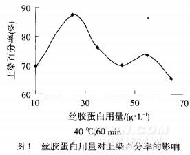 從圖3可知,<40℃時,隨著處理溫度的升高,上染百分率呈現上升趨勢;當溫度上升至40℃時,上染百分率最佳;>40℃時,隨著溫度升高,上染百分率逐漸減低.原因是當改性溫度升高時,絲膠蛋白溶液中的蛋白質分子熱運動加劇,大分子鏈在溶液中呈伸展狀態,肽
