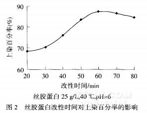 60min后,一方面絲膠蛋白吸附達到平衡,另一方面隨著反應時間的繼續延長,絲膠蛋白逐漸進入竹原纖維的內部,對纖維會產生一定的剝損作用,上染百分率略有下降,因此改性時間確定為60min.