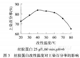 鏈上有較多的氨基、羥基等活性基團暴露在外,使絲膠蛋白與氧化竹原纖維大分子上的醛基反應幾率增加。和氧化竹原纖維上的醛基發生共價鍵結合,使竹原纖維素纖維在染浴中呈正電性,加大了竹原纖維對染料的吸附能力,使上染百分率得到提高.I71溫度過高,絲膠蛋白易發生變性,產生凝固,使得氧化竹原織物與絲膠蛋白交聯改性作用減小,致使上染百分率下降,所以改性溫度確定為40℃