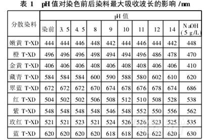 從表1可見,染料在不同pH值條件下的最大吸收波長變化不大,說明pH值對色光影響不大,也即在堿性條件下染料的結構未遭到破壞,反映了T-XD系列分散染料的耐堿性能十分優異,能滿足分散/活性一浴一步法染色工藝對分散染料耐堿性的要求。