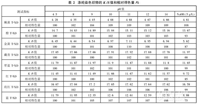 表2中, pH值在4. 5~14. 0時,T-XD系列分散染料在堿性浴條件下染色得到的K/S值和得色量與酸性浴相比,非但沒有下降,反而有不同程度的上升,這進一步說明了T-XD系列分散染料具有很好的耐堿性能。