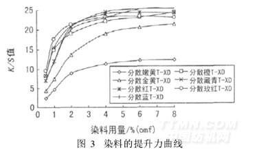 從圖3可以看出,在染料質量分數從0. 5% (omf)增加到4% (omf)時,幾乎所有染料染色織物的K/S值都迅速提高,說明在這一染料質量分數范圍內,這些染料的提升性能都很好。染料質量分數超過4%以后,隨著染料質量分數的提高,提升力曲線的斜率變小,說明染色織物的K/S值增加速度變慢,染料的提升性下降。染料質量分數達6% (omf)以后,大部分染料的提升力曲線趨于平緩,說明染料的提升力不再增加,但少數幾只染料在染料質量分數超過6%以后,K/S值仍有緩慢增加,如分散金黃T-XD、分散藏青T-XD、分散橙T-XD等。分散嫩黃T-XD的提升力曲線最為平緩,這是由黃色染料的顏色特性所決定的,并非染料本身的提升力就低。
