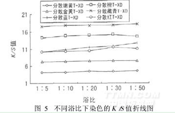 從圖5可以看出,大部分染料的浴比依存性很低,在不同浴比下染色后測得的K/S值都是在一個很小的范圍內波動,考慮到試驗誤差的影響,可以認為染色浴比的變化對染料的上染性能影響不大。少部分染料,如分散紅T-XD的K/S值則隨浴比的加大而增加,在浴比1∶30下K/S值達到最大值,但上升的幅度很小,可以認為不影響應用性能。實際應用中,可以根據需要盡量選擇小浴比進行染色,以滿足當前染整工業對節能降耗和環保的要求。
