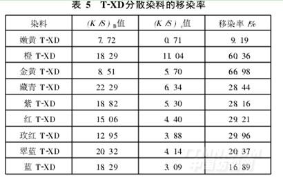 從表5可以看出,除了分散嫩黃T-XD的移染率較低(小于10% ),分散橙T-XD和分散金黃T-XD移染率較高(大于60% )以外,大部分染料的移染率在20% ~30%,基本能滿足生產(chǎn)需要。黃色系染料分散嫩黃T-
