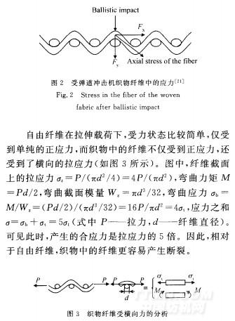 Roylance等'2。。指出,除了纖維的性能之外,織物的組織對(duì)材料的防彈性能同樣有著很大的影響。Karahan~等認(rèn)為,對(duì)于機(jī)織物,由于交織的作用,紗線必定存在彎曲,當(dāng)織物表面受到?jīng)_擊作用的時(shí)候,作用力就會(huì)產(chǎn)生水平方向以及垂直方向的分量F和F(如圖2所示),這會(huì)導(dǎo)致紗線之間相對(duì)滑移嚴(yán)重,產(chǎn)生更大創(chuàng)傷。
