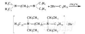 盧婷[9]等用BrC12H25和N,N,N',N'-四乙基-1,2-乙二胺等合成了一種具短聯結基團的陽離子型Gemini表面活性劑二亞甲基-1,2-二(十二烷基二乙基溴化銨),簡寫作C12C2C12(Et).將16.42gBrC12H25置于圓底燒瓶中,再加入25mL乙腈,加熱至沸,并將溶于乙腈(12mL)的N,N,N',N'-四乙基-1,2-乙二胺(5.15g)滴入燒瓶中,加熱回流并補加乙腈,使溶劑量基本保持不變.回流48h后除去溶劑得到棕色固體.用乙醇-乙酸乙酯重結晶6次即得較純的產物,化學方程式為: