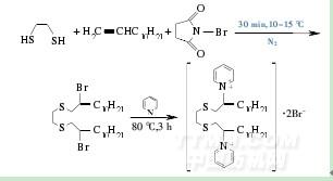 BhadaniA[32]等合成了一種支鏈含有吡啶的硫鍵聯結基陽離子型Gemini表面活性劑,其合成工藝為:將6.72g十二碳烯和7.12g N-溴代琥珀酰亞胺的氯仿溶液(150mL)加入到1,2-二硫乙烷中,在10~15℃、氮氣環境中反應30min.溶于60mL正己烷并濾除沉淀雜質,清水洗滌后用無水硫酸鈉干燥.然后稱取5.88g上述產物加入到1.97g嘧啶中,并在80℃反應3h.反應完成后冷卻并在丙酮中洗滌提純,干燥后即得產物,反應式如下: