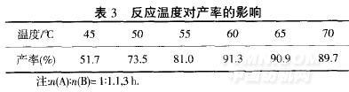 從表3可以看出,反應體系中隨著溫度的升高,目標產物的產率逐漸增加,反應溫度到60qC時,產率達91.3%,再繼續升高溫度,產率趨于平緩并略有下降.原因是二甲基烯內基胺與4一溴甲基二苯甲酮在季銨化反應中,由于二甲基烯丙基胺堿性較弱,而且分子體積較大不利于反應的進行.因此,季銨化反應需要在較高的溫度下進行,另外,二甲基烯丙基胺在較高溫度下易揮發或發生自聚反應,導致其產率略有降低,因此,選擇合成反應溫度為60.