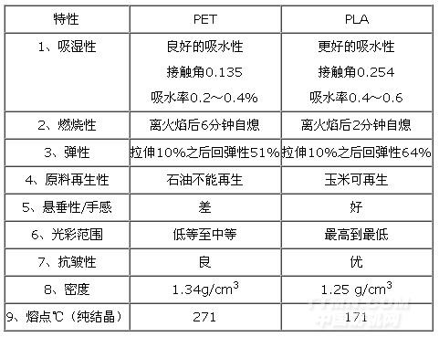 與PET相比,PLA更具有親水性,更具有良好的手感,懸垂性和舒適性,優良的卷曲性和卷曲度保持性;將縮率可以人為控制;PLA纖維強度大于7g/d;具有抗紫外線能力;密度比PET低,染色性能好,染色牢度好,可用分散性染料染色; PLA不易燃燒,即使燃燒后發煙量也少,表1表示PLA與PET性質的差異。
