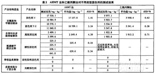 為了比較2種方法對樣品測試的差異,分別采用AHMT分光光度法和乙酰丙酮分光光度法對不同類型固色劑進行測試,結果見表2。