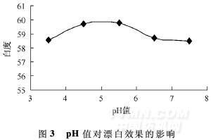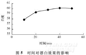 度降低。開始時,漂液中漂白有效成分的濃度較高,增加時間,白度的提高明顯,到達一定時間以后,由于有效漂白成分被消耗,濃度降低,漂白效率降低,時間增加,白度提高得比較緩慢。由圖5可知,漂白時間30 min比較合適。