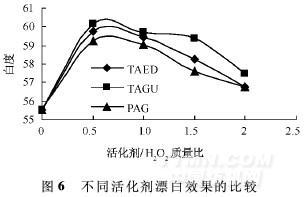 這3種活化劑均為有機酰類化合物,漂白活化的原理也幾乎相同,都是通過和H2O2的水解反應,使過羥基離子酰基化,產生過氧乙酸而起作用[4]。過氧酸是比H2O2更活潑的漂白劑,能在較低的溫度和pH值條件下有效地漂白。不同活化劑對漂白效果的影響見圖6。
