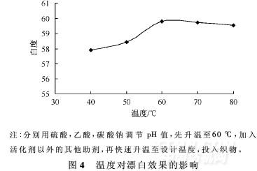 溫度對漂白效果的影響如圖4所示。由圖4可以看出,隨著溫度的提高,織物的白度先提高后降低;過氧酸等有效漂白成分的反應速率提高,相同時間內參與漂白的過氧酸量增加,織物的白度提高;過氧酸穩定性降低,無效分解率增加,起漂白作用的有效成分減少;開始時,漂白速率增加為主要方面,織物的白度增加;到達一定溫度以后,漂白有效成分減少成為主要方面時,織物的白度開始下降。由圖4可知,60℃時織物的白度最高。