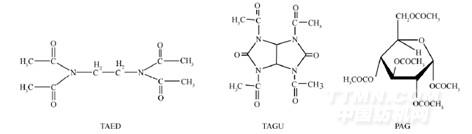 四乙酰乙二胺(TAED),四乙酰甘脲(TAGU),五乙酰葡萄糖(PAG)是文獻中經常報道的3種活化劑。3種活化劑的分子結構為: