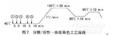 滌棉織物一浴法染色有兩種方法,即一浴一步法和一浴兩步法。與一浴兩步法相比,一浴一步法流程更為簡(jiǎn)單、時(shí)間短、耗能省,但對(duì)染料的要求比較高,在染料選擇和工藝設(shè)計(jì)中有一定的難度。一浴一步法染色又可分為酸性、中性、堿性和pH值滑移法等4種方法。本試驗(yàn)選用中性條件,用緩沖劑調(diào)節(jié)pH值為7,所用染色織物為滌棉(85/15),浴比1:l0,染色工藝流程見圖2。