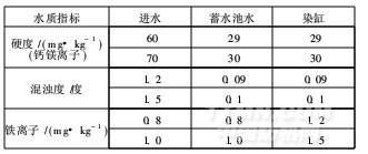 染紗用水取自深井水,將其軟化和凈化后達到一定的混濁度和硬度指標才能使用?;鞚岫缺硎竟饩€透過時,水中懸浮物及膠體物的阻礙程度,以1L蒸餾水中含有1mg懸浮物為一個混濁單位。水硬度則指水中鈣、鎂離子的總濃度,單位為mg/L。水中鐵離子(參考企業標準Q/LKBJ/B.2008)及硬度采用試紙快速測試,之后再與樣卡進行比對判定。進水、軟化凈化水和染缸水的水質見表1。