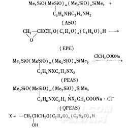 在裝有攪拌器、溫度計(jì)和回流冷凝管的250mL三頸瓶中,加人ASO 30g、EPE 12.15g和醇溶劑30%(占反應(yīng)物的質(zhì)量分?jǐn)?shù)),攪拌升溫至60~85℃,恒溫反應(yīng)2~3h,得中間體PEAS。在該體系中繼續(xù)加入計(jì)量氯乙酸鈉,升溫至7O~90℃,反應(yīng)4h,減壓蒸除溶劑及低沸物,得無(wú)色至淡黃色透明液體,即目標(biāo)化合物QPEAS。