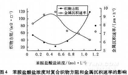 保持AniHC1:APS(摩爾分數比)為5:2不變,改變AniHCL濃度(0.1、0.3、0.5、0.7、0.9、1.1mol/L),制備方阻值分別為70.98、25.97、2.19、10.16、18.03、29.91kD./l-q的PANI/PA織物,并在相同條件下化學鍍銀,研究AniHC1濃度對復合織物方阻和金屬沉積速率的影響,結果見圖4。