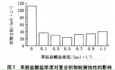 取不同AniHC1濃度條件下制備的Ag/PANI/PA復合織物,觀察其在5%NaC1溶液浸泡24h后的方阻值變化,用于評價耐腐蝕性能,結果如圖5所示。