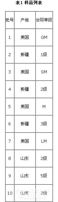 為了保證比對(duì)的結(jié)果更具代表性,選取不同品質(zhì)、不同級(jí)別的多批樣品進(jìn)行測(cè)試。品種單一、品質(zhì)優(yōu)良、物理性能一致性好的棉花在檢測(cè)中出現(xiàn)誤差的可能性較小,為保證檢測(cè)樣品品質(zhì)的一致性和均勻性,在對(duì)樣品選擇時(shí),盡量選取這種性質(zhì)的棉花。