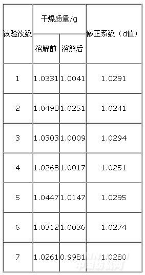 由表1可以計算出,棉的修正系數(shù)d值的7次試驗平均值,結(jié)果為1.01。