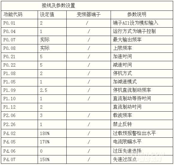 在大圓機運轉中,絕對不能讓電機反轉以及回轉現象,否則針床的針將被折彎甚至斷針。有些大圓機接入單向軸承,可不予考慮。要是系統正反轉完全取決于電機的正反轉控制,則需要設置合理的參數,一方面要設置禁止反轉功能,另外一方面需要直流制動功能。還要注意不能出現失速現象,以免造成斷針等損失。本方案采用模擬量輸入給定頻率。線路簡單(省略)大圓機要求起動時響應要快,低頻大轉矩輸出;停機時要光滑、柔和一些,以保護針床。因此合理設置上表參數是充分發揮圓機性能的保證,原則是通過調解P0.19,P9.00參數得到最佳的低頻轉矩輸出能力以及降低圓機高速運行的振動,通過調起停控制(P1組)以及加減速度時間參數(P0組)得到頻率調節的光滑性。