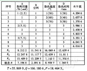 通過以上單因素優化試驗,即染料用量、染色溫度、染色時間、染色浴比對棉織物染色效果的影響,分別選取3個水平進行L9(34)正交試驗。以染色織物表面色深度(K/S值)為指標,正交試驗試驗方案及結果分析見表5。利用軟件PASWStatisitcs18對表5進行方差分析,結果見表6。