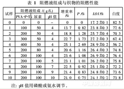 試驗考察了阻燃劑PVA-P-Ti和尿素用量對整理織物阻燃性能的影響,結果見表1。