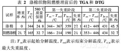 按上述優化工藝對織物進行阻燃整理前后的熱重分析測試(TGA)和差示掃描熱量分析(DTG),結果見表2。