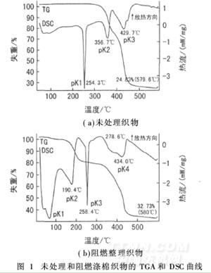 圖1是阻燃整理前后織物的TGA和DSC測試結果。