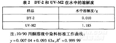 由表2可以看出,DY-2還原為UV—M2后,溶解度明顯增大。這是由于DY-2結(jié)構(gòu)中的偶氮鍵連接了兩個(gè)芳香環(huán)結(jié)構(gòu),形成較大的共軛體系,分子平面性好,吡啶酮結(jié)構(gòu)中的羥基與偶氮鍵形成的氫鍵比較牢固;當(dāng)還原生成苯并三唑結(jié)構(gòu)后,兩個(gè)芳環(huán)結(jié)構(gòu)的共軛性被破壞,分子平面性變差,吡啶酮結(jié)構(gòu)中的羥基與三唑環(huán)形成的氫鍵易被破壞,羥基更容易解離,造成其水溶性增大。