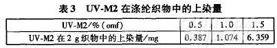 由表3可以明顯看出,uV—M2對滌綸的上染量隨著紫外線吸收劑用量的增加而增加,與分散染料上染滌綸的規(guī)律相符。隨著用量增加,上染量上升規(guī)律較為異常,可能是由于當(dāng)紫外線吸收劑用量增加時(shí),uV—M2在水中溶解達(dá)到飽和,從而使吸附在滌綸上的uV—M2量增加。