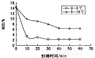 封端是放熱反應,封端溫度要盡可能低,只有這樣,亞硫酸氫鈉才有可能與活潑的高分子物發生反應,但是釋放的熱量又會加劇其可逆反應和副反應。封端溫度和時間對封端反應的影響見圖3。