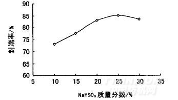 在反應過程中,亞硫酸氫根離子和水均可與一NCO基反應,所以,亞硫酸氫根離子的質量分數對封端率有一定的影響,NaHSO3的質量分數對封端率的影響如圖5所示。