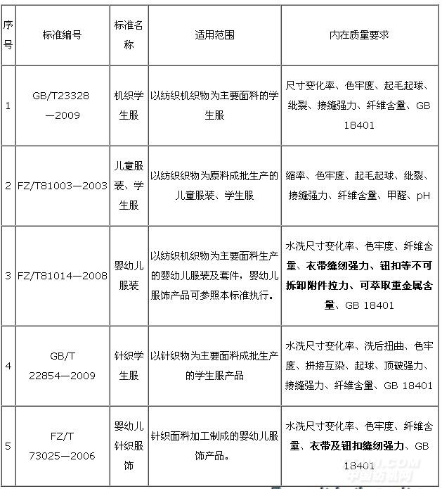 我國現(xiàn)行紡織品標準體系中,適用童裝產(chǎn)品的標準有5個,分為梭織和針織兩大類。這些標準均按外觀質(zhì)量和內(nèi)在質(zhì)量兩方面考核產(chǎn)品質(zhì)量,產(chǎn)品基本安全技術(shù)要求執(zhí)行GB 18401《國家紡織產(chǎn)品基本安全技術(shù)規(guī)范》要求。具體見表1。