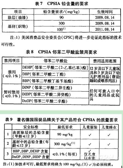 美國“消費品安全改善法(CPSIA)”已于2008年8月14日正式生效,CPSIA法對兒童(年齡為12歲及以下)產品中鉛和6種鄰苯二甲酸鹽含量有嚴格的限制要求(表7、表8),并制定了嚴格的監管程序。從功能紡織品的角度來看,這兩類物質主要存在于涂層整理,尤其是聚氯乙烯(PVC)涂層整理產品。為了提高PVC涂層的穩定性,生產廠家有時會在涂層漿料中添加一定數量的鉛。同樣,鄰苯二甲酸鹽作為增塑劑,會在PVC涂層加工中被經常用來提高涂層的性能。從目前情況來看,涂層整理產品中被檢測出鉛的幾率較小,但卻有不少兒童涂層整理產品被查出鄰苯二甲酸鹽超標。從美國CPSIA的實施可知,防水涂層、阻燃涂層等涂層紡織產品中的鉛含量將會受到嚴格限制對兒童涂層紡織品中的鄰苯二甲酸鹽含量,將采取與歐洲市場相同的限值。國際服裝品牌對銷往美國市場的紡織產品幾乎全部制定了符合CPSIA的質量要求,并出具符合聲明(表9)。