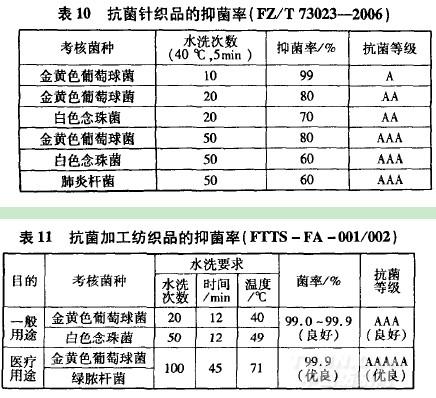世界各國(guó)對(duì)抗菌紡織品的評(píng)價(jià),一直非常重視抗菌性能的耐久性??咕砑徔椘沸枰谝?guī)定條件下通過(guò)多次水洗,然后進(jìn)行抗菌效果測(cè)試和評(píng)價(jià)。如我國(guó)紡織行業(yè)抗菌針織品標(biāo)準(zhǔn)(FZ/T73~3-2006)中,將抗菌針織品按耐洗滌次數(shù)(10~50次)及考核菌種數(shù)量的多少分為A級(jí)、從級(jí)、AAA級(jí)三個(gè)抗菌級(jí)別[抗菌耐久性越好,級(jí)別越高(表l0)]。臺(tái)灣地區(qū)紡?fù)貢?huì)標(biāo)準(zhǔn)(兀一FA一001/002)對(duì)一般用途和醫(yī)療用途抗菌加工紡織品的耐久性要求更高,洗滌次數(shù)、洗滌溫度和洗滌時(shí)間更為嚴(yán)格(表11)。