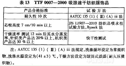 國際買家和客戶的質(zhì)量標準往往會結合銷售國家的法律規(guī)定、實際市場需要和品牌要求,對功能紡織品的耐久性提出不同的要求。縱觀著名國際品牌和買家的質(zhì)量標準,對功能紡織品的耐久性要求不一,但幾乎皆有耐久性要求(表l4一表16)。英國瑪莎百貨目前在中國采購約25大類功能紡織品,涵蓋抗菌、拒水、防風、保溫、吸濕快干、免燙等,其中抗菌家紡產(chǎn)品(sleepsafe)要求原樣和按洗標洗滌5次后,樣品對于肺炎桿菌、金黃色葡萄球菌和大腸桿菌的殺菌率不得少于99.O%。抗菌服飾產(chǎn)品(skinkind)要求測試按洗標洗滌5次后的抗菌效果。純棉吸濕排汗產(chǎn)品(realcoolcotton)則要求分別進行30次(休閑服、男式和兒童T恤衫)和2O次(休閑褲)水洗后,測試產(chǎn)品的水分蒸發(fā)和毛效。拒水(waterrepellent)和防雨(storm wear)產(chǎn)品的耐久性要求是,外衣按洗標洗滌和烘干10次,其它可洗滌產(chǎn)品必須按洗標洗滌和烘干20次。僅可干洗的產(chǎn)品則要5次干洗,僅可干洗的外衣應進行4次干洗。吸濕排汗抗菌產(chǎn)品(coolandfresh)有洗滌20次的耐久性要求,柔軟吸濕排汗抗菌產(chǎn)品(softcoolfresh)有40次的耐久性要求。防雨產(chǎn)品(showerresistant)的耐久性要求是,按洗標洗滌和干燥3次(可機洗外衣)和10次(其它產(chǎn)品),或2次(外衣)和5次(其它產(chǎn)品)干洗。由此可見,耐久性是功能紡織品不容忽視的國際買家要求,而這也恰恰是功能紡織品在開發(fā)和生產(chǎn)中應該進一步引起重視的問題。