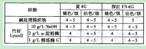 將經(jīng)過不同條件前處理的竹材Lyocell纖維織物和棉織物用黃4G和深紅FN-6G分別染色,測(cè)定其耐洗色牢度,見表4。
