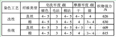 從表4可以看出,色媒體改性絲/棉織物染色牢度與傳統工藝相當;強力保留率明顯優于傳統染色工藝。這是由于染色過程中沒有使用鹽和堿,纖維的損傷程度減小。