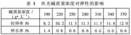 采用布鋏絲光機對織物進行堿處理。軋車壓力0. 15MPa,張力0. 2MPa,織物不上鋏,處理時間90 s,堿質量濃度對織物彈性的影響見表1。