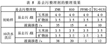 易去污整理劑80 g/L,軋余率60%,二浸一軋,預烘110℃×2min,焙烘170℃×90 s,易去污整理劑的整理效果見表5。