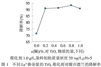 稱取一定量TiO2粉末于燒杯中,加入一定量水,按照La3+摻雜摩爾分數分別為0.2%、0.5%、0.8%、1.0%、1.2%稱取相應量的氧化鑭,溶于硝酸中;將溶解得到的硝酸鑭溶液倒入上述燒杯中,在超聲波清洗器中共振3 h后蒸干,得到摻雜鑭的TiO2粉末,將其置于馬弗爐中于一定溫度下焙燒2 h,冷至室溫后研磨待用.
