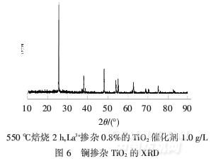 由圖6可知,鑭摻雜TiO2粉體的銳鈦礦相各晶面的衍射峰很明顯,說明經過摻雜的光催化劑內大部分為銳鈦礦型.