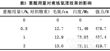 仍按照1.2中的工藝,采用蒽醌作為去木質素的助劑對織物進行煮練。其中蒽醌的用量為0.5%、1%和2%(對織物重),織物進行煮練和氧漂后測得毛效、白度、強力,結果見下表3。